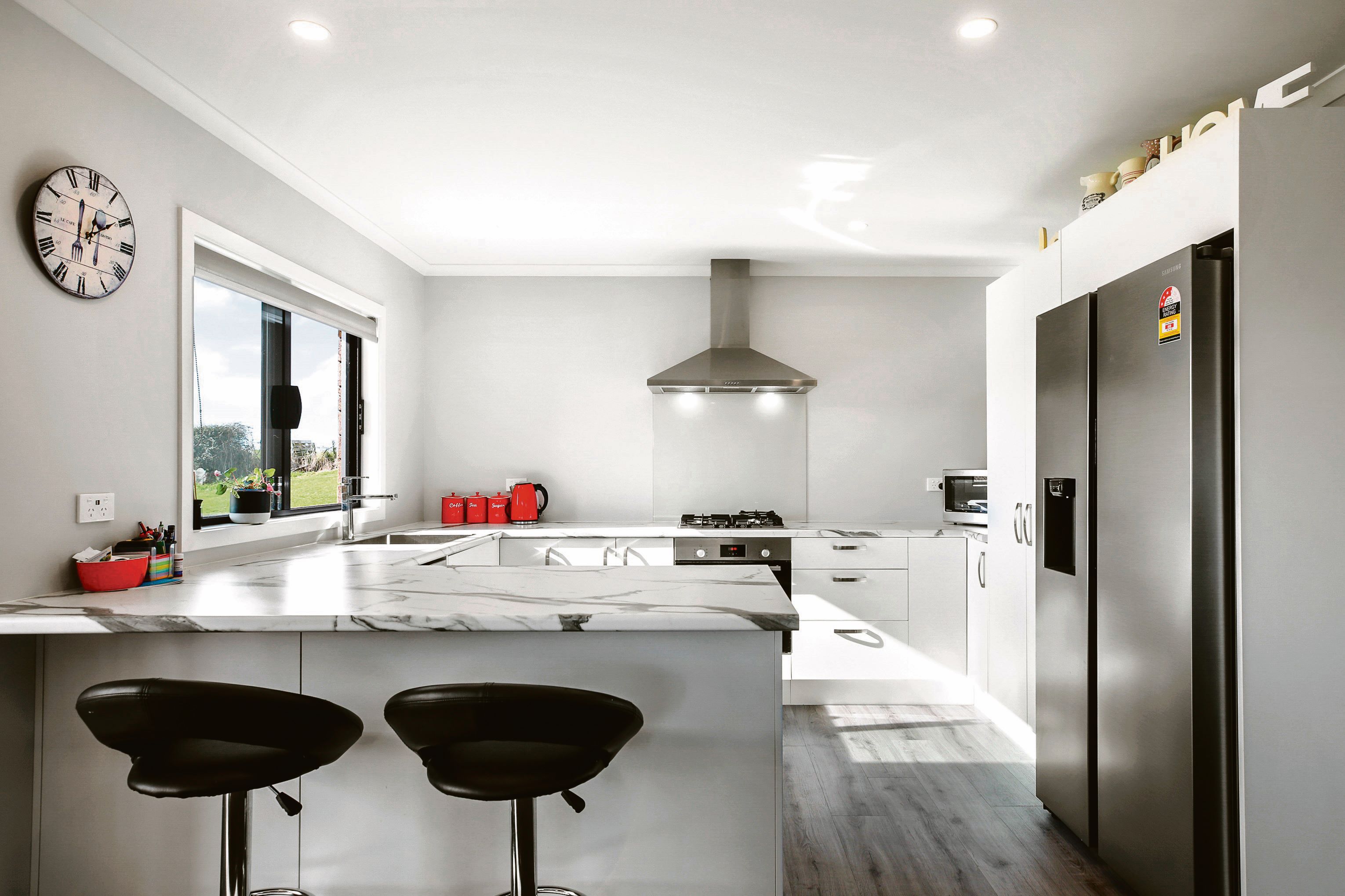 The light and bright combined kitchen, dining and lounge area is private from the road, overlooking the countryside and offering views of Mt Pirongia to the west. Flowing off the living area, which is heated and cooled by a wood burner and heat pump, is the rumpus or second lounge that can be shut off for more privacy and ambience.
