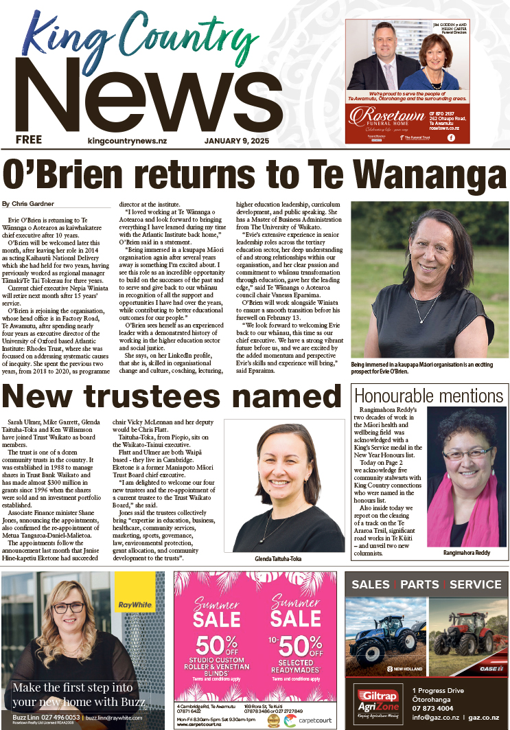 O’Brien is rejoining the organisation, whose head office is in Factory Road, Te Awamutu, after spending nearly four years as executive director of the University of Oxford based Atlantic Institute: Rhodes Trust, where she was focussed on addressing systematic causes of inequity. She spent the previous two years, from 2018 to 2020, as programme director at the institute.